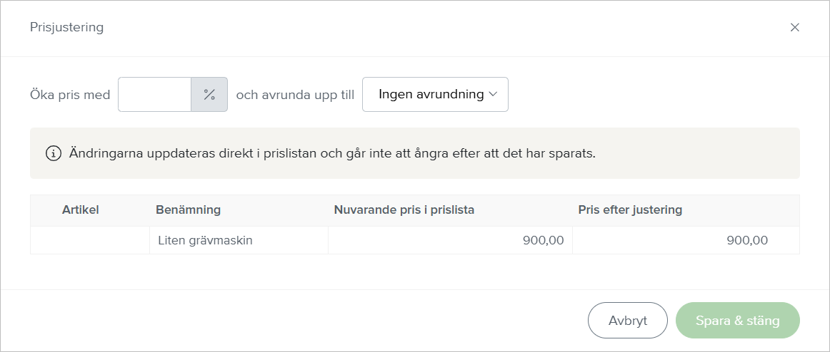 Du som administratör kan nu justera priset på artiklarna i prislistan med hjälp av en procentsats och välja om priset ska avrundas uppåt. Du öppnar din prislista under Inställningar - Artiklar & priser - Prislistor, markerar vilka artiklar du vill ändra priset på och klickar på knappen Prisjustering uppe till höger. Där kan du välja hur många procent du vill öka/minska priset med och om du vill att det ska avrundas. Smidigt!