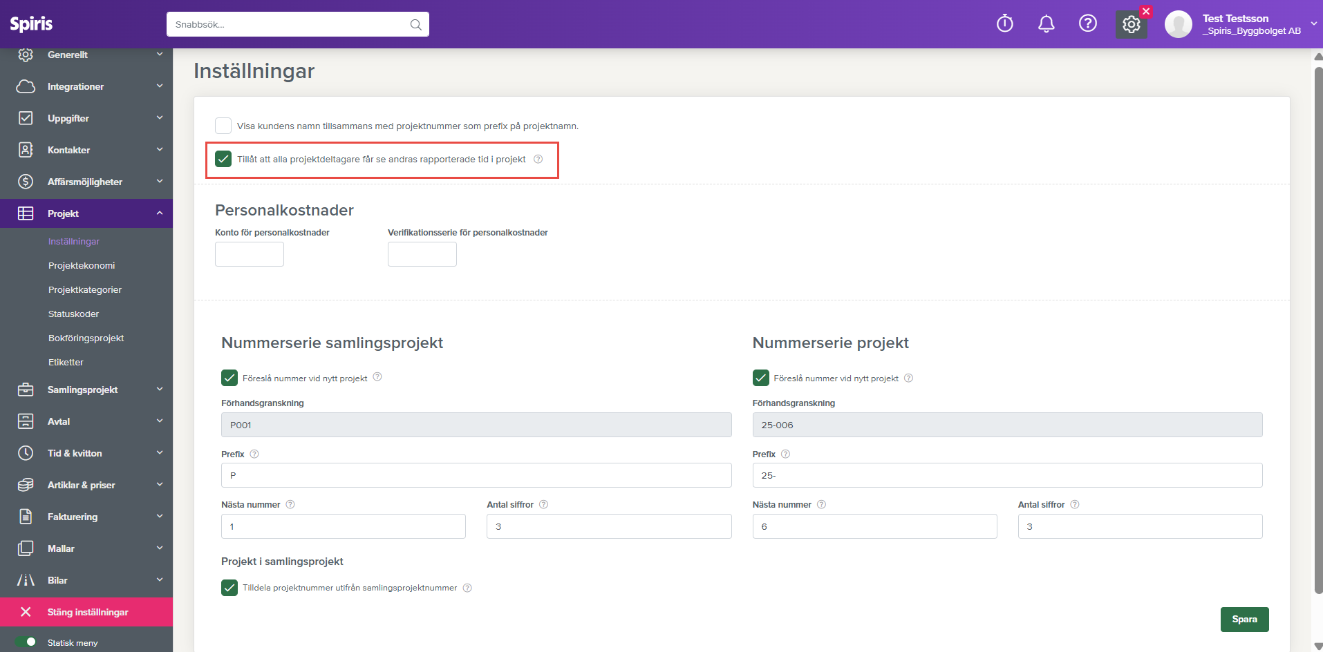 Nu kan du välja om du vill att alla projektdeltagare ska se varandras rapporterade tid i ett projekt eller om de bara ska se sin egen tid. Detta görs genom inställningen Tillåt att alla projektdeltagare får se andras rapporterade tid i projekt som du hittar under Inställningar - Projekt - Inställningar. Oavsett vad du väljer så har projektledare och ansvariga fortsatt full överblick. Läs mer om Inställningar, projekt.