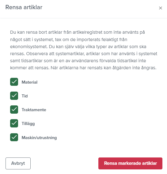Den som är administratör kan nu radera flera artiklar av en viss artikeltyp samtidigt. Den här funktionen kan vara bra för att till exempel ta bort artiklar som aldrig har använts eller som har importerats felaktigt. Du väljer själv vilken/vilka typer som ska raderas. Systemartiklar, artiklar som har använts i programmet och tidsartiklar kommer inte att rensas. När artiklarna har raderats går det inte att ångra sig.