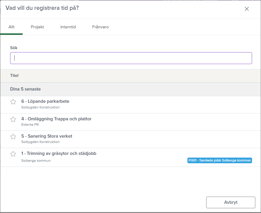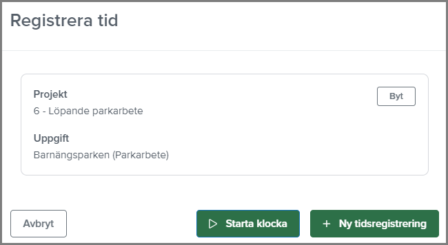 Uppe i menyraden finns nu en klock-ikon. Klickar du på den så får du direkt möjlighet att registrera din tid eller starta klockan för ett projekt eller för interntid eller frånvaro.