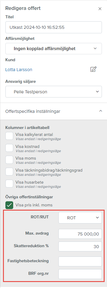 Uppgifter om rot/rut direkt i offerten