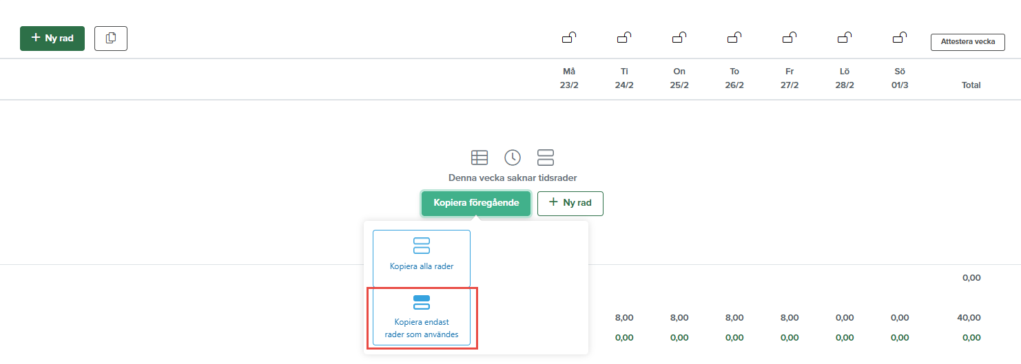 Under Tid & kvitton - Tidsregistrering har knappen Kopiera endast rader som användes tillkommit. Knappen visas när du har valt Vecka som visningsläge, veckan saknar rader och du klickar på Kopiera föregående. Valet innebär att endast de rader som har tidregistreringar på sig kopieras över till den aktuella veckan. Du får alltså endast med dig raderna som det finns registreringar på, inte själva tidregistreringen.