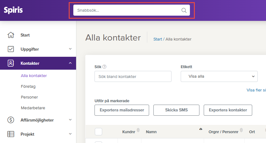 Snabbsök använder du för att söka efter ett företag, en person eller ett projekt. Sökträffarna är relaterade till varandra - söker du till exempel efter ett företag så visas företaget, men även projekt och personer som är knutna till företaget.