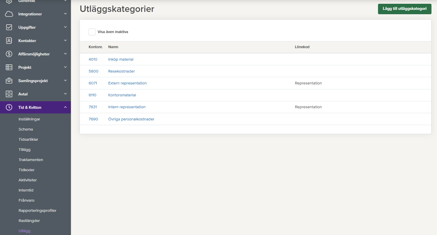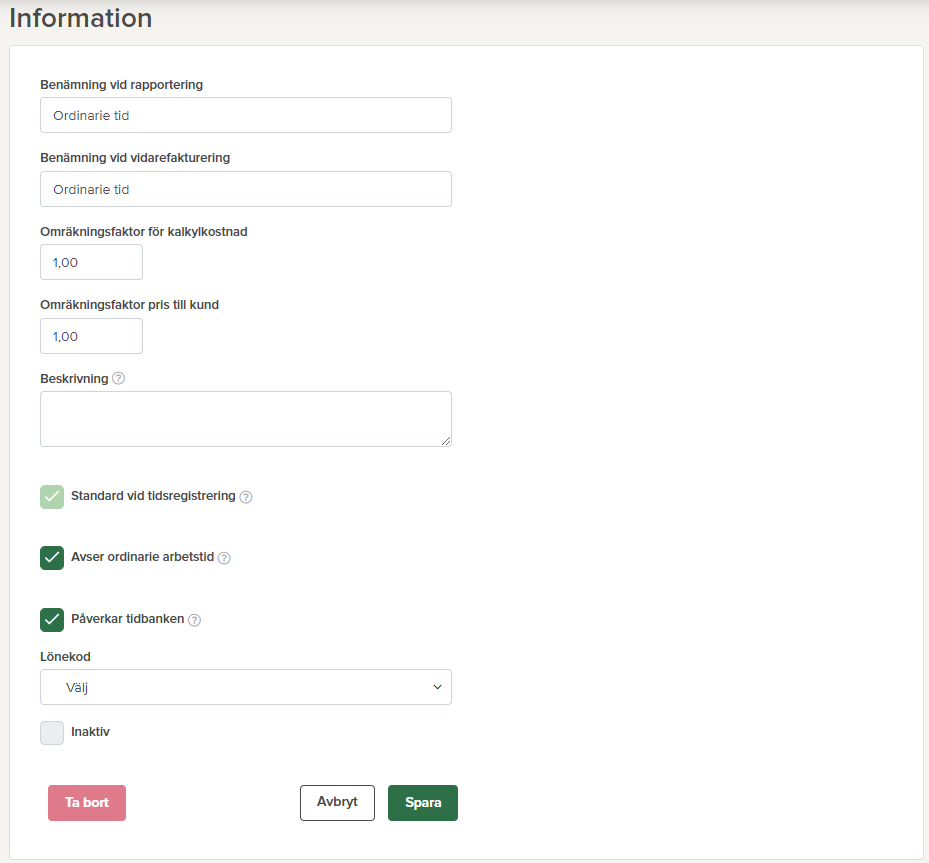 All tid som registreras mot projekt och interntid styrs av tidkoder. Tidkoden innehåller omräkningsfaktorer och lönekoder och bestämmer även om det är ordinarie arbetstid, övertid och om tidbanken ska påverkas eller inte. Du skapar och kontrollerar tidkoder under Inställningar - Tid & kvitton - Tidkoder. Läs mer i avsnittet Skapa tidkod.