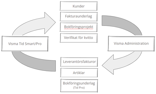 Att ha en koppling till Visma Administration innebär att Tid används som ett försystem till Visma Administration. Det är i Tid som de anställda registrerar tid och arbetar med kundens projekt och prissättning. Det är också här du sammanställer fakturaunderlag. Fakturaunderlagen kan du sedan läsa in i Visma Administration, antingen som fakturor eller ordrar (Administration 1000/2000). Möjligheten att läsa in underlag som ordrar gör att du löpande kan uppdatera ditt Visma Administration med uppgifter från Tid, till exempel för att få kontroll över disponibelt antal i lager. Visma Administration används sedan för att vidarefakturera dina uppdrag till slutkund.