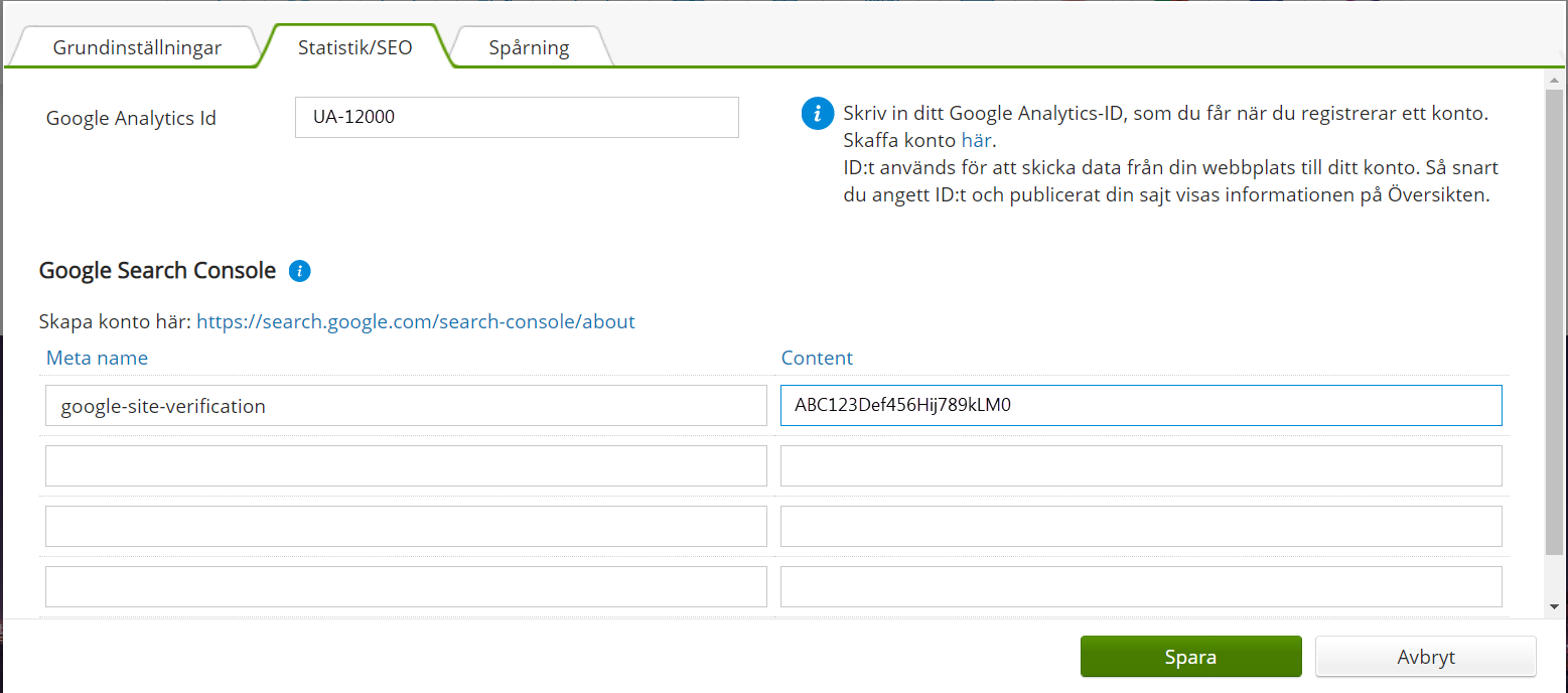 - Välj fliken Statistik/SEO under Inställningar - Grundinställningar.